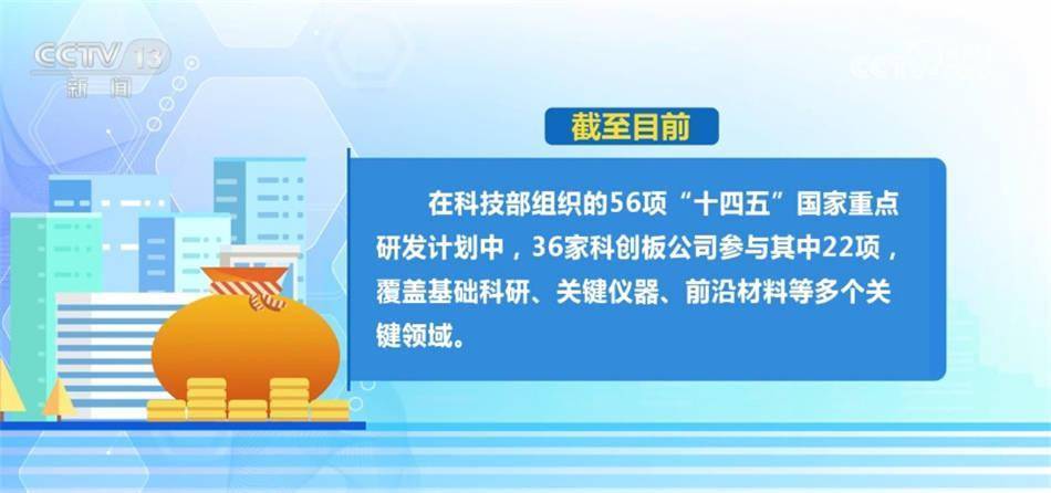 截至目前,在科技部组织的56项“十四五”国家重点研发计划中,36家科创板公司参与了其中22项,覆盖了基础科研、关键仪器、前沿材料等多个关键领域。
