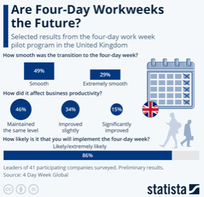 该实验证明“上四休三”对雇主和雇员都有好处,有86%的企业表示可能在实验结束后保持这个工作模式。