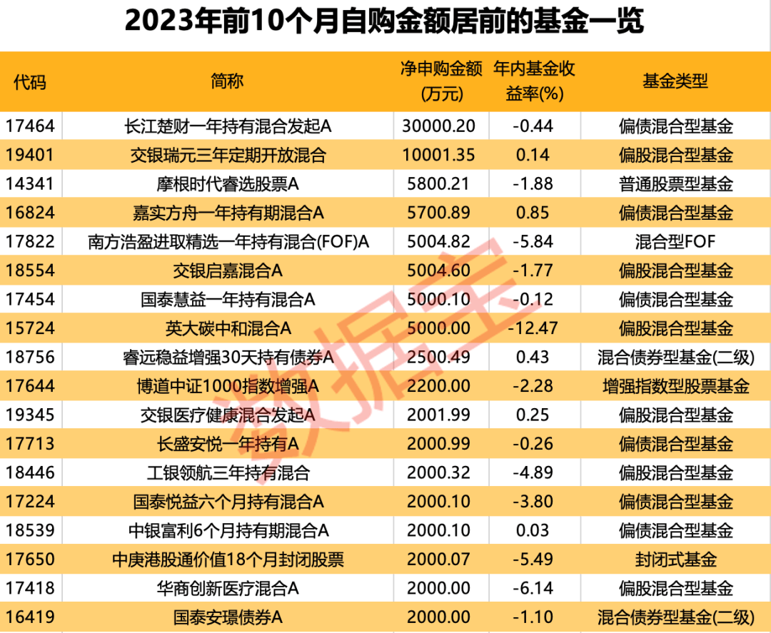 单只基金方面,剔除债券型基金、养老目标FOF及REITs后,前10月共计18只基金自购金额在2000万元及以上。其中,长江楚财一年持有混合发起A、交银瑞元三年定期开放混合、摩根时代睿选股票A位列前三,自购金额依次为3亿元、1亿元、5800.21万元。