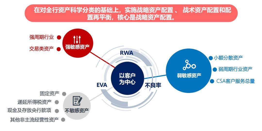 而浙商银行周期战略的差异之处,就在于对“经济周期弱敏感资产”的理解更科学更全面 ,不仅仅看到了眼前的弱周期行业,更按照“最大共识、最小范围”的原则,基于“服务本行客户”的原则和“RWA、EVA、不良率”3个量化指标建立了“1+3”分类标准,“化一为三”,通过将全行经济周期弱敏感资产分为小额分散资产、弱周期行业资产和CSA客户服务总量三类,将风险规避和业务多元化相融合,实现经营的整体提质。