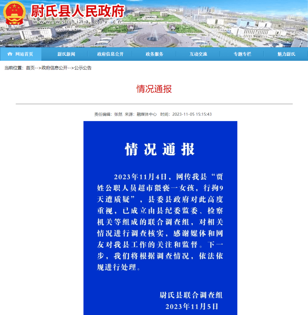 2023年11月4日,网传我县“贾姓公职人员超市猥亵一女孩,行拘9天遭质疑”,县委县政府对此高度重视,已成立由县纪委监委、检察机关等组成的联合调查组,对相关情况进行调查核实,感谢媒体和网友对我县工作的关注和监督。下一步,我们将根据调查情况,依法依规进行处理。