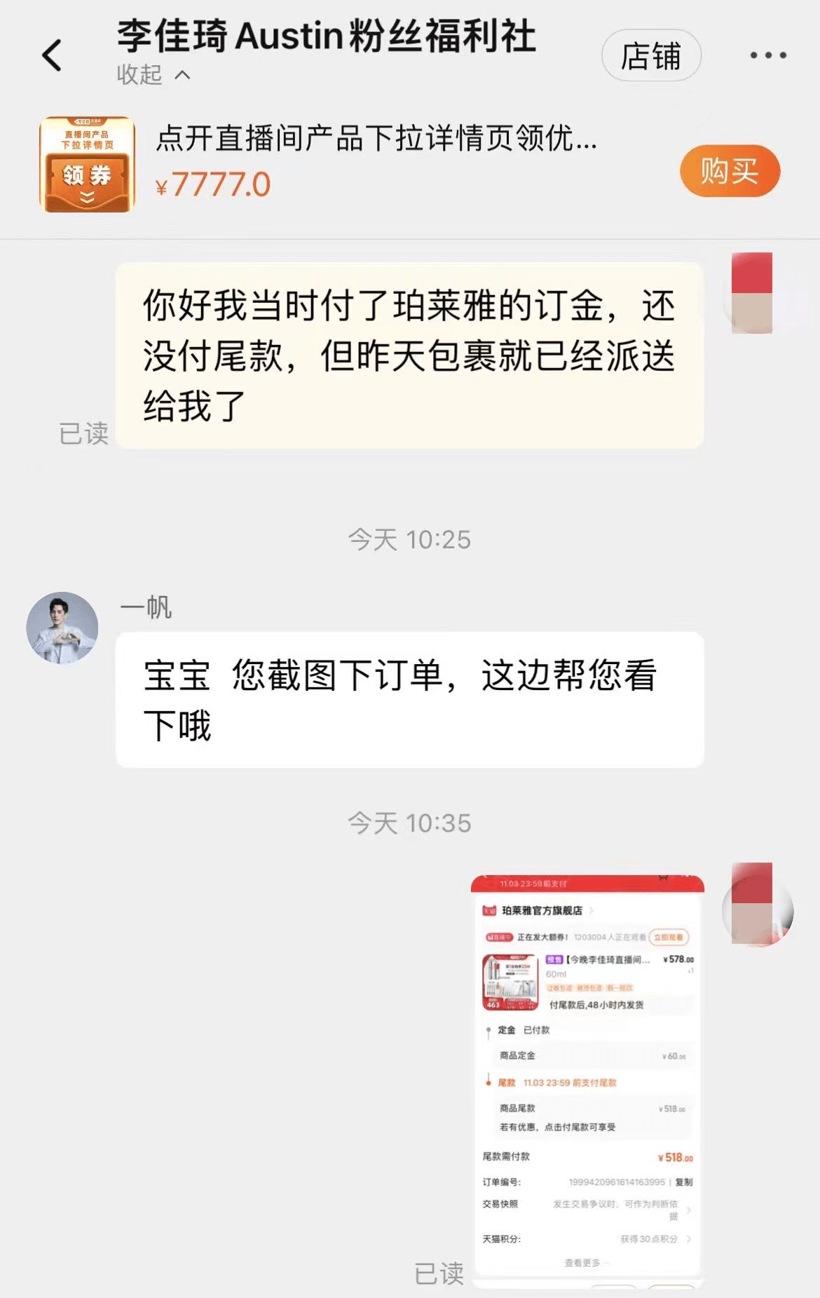 11月3日,李佳琦又上热搜,这次的词条是“李佳琦直播间疑为冲销量未付先送”。据消费者反映,他们在李佳琦的直播间下单购买了珀莱雅的产品,虽然已经付了定金,但尾款还未支付。然而,昨天一早快递就已经派送到家。派送的快递员明确表示多个件都出现类似问题,“快递员说物流信息也发现了异常,但问题到底出在什么环节不清楚。”
