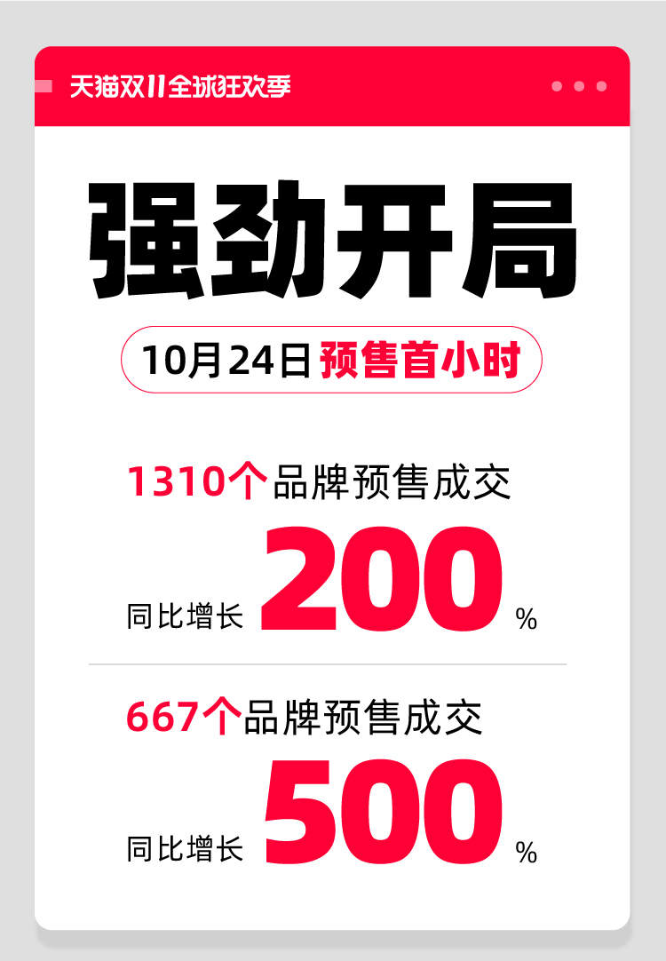 10月24日晚8点,天猫双11开启预售。天猫战报显示,1小时内,成交额同比增长超200%的品牌达1300多个,成交同比超500%的品牌数近700个。珀莱雅、欧莱雅、海尔、斐乐、兰蔻、美的、娇兰、耐克等品牌成交额连续破亿,花至、且初等国货新品牌也实现破亿。