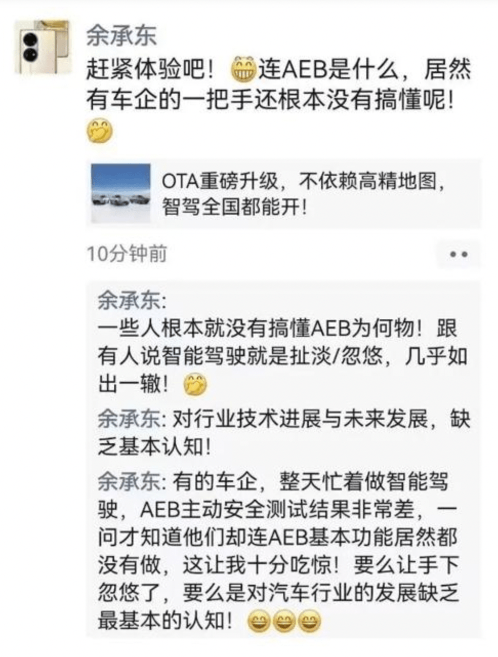 11月3日,余承东先是在朋友圈转发一篇名为《OTA重磅升级,不依赖高精地图,智驾全国都能开》的文章,提及华为ADS2.0高阶智能驾驶升级后,带来AEB增强、主动安全的能力等,并附上转发语:“赶紧体验吧!连AEB是什么,居然有车企的一把手还根本没搞懂呢!”