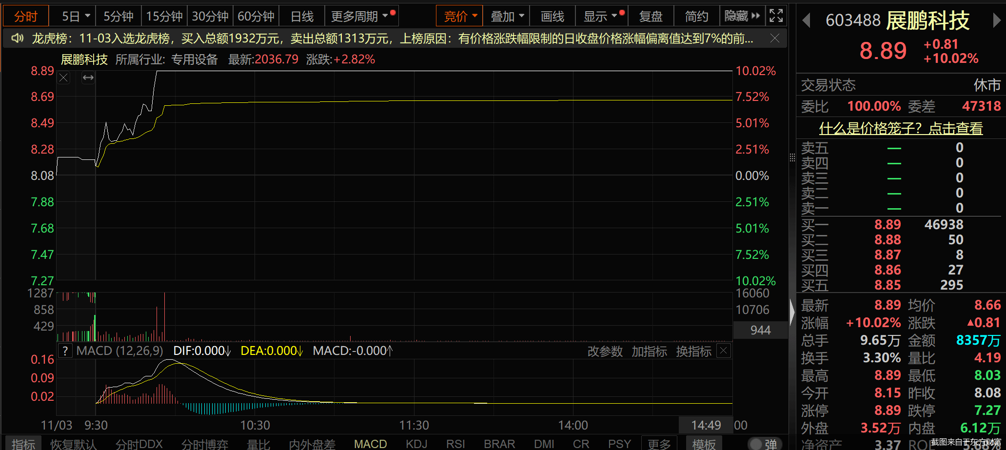 值得注意的是,在停牌前,展鹏科技股价提前冲上涨停。