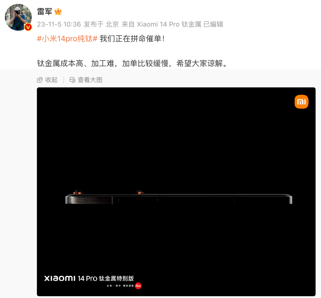 10月26日小米发布了全新小米14系列,其中小米14 Pro带来了一个钛金属特别版,但发售以来一直很难抢到,今天雷军在微博进行了回应。