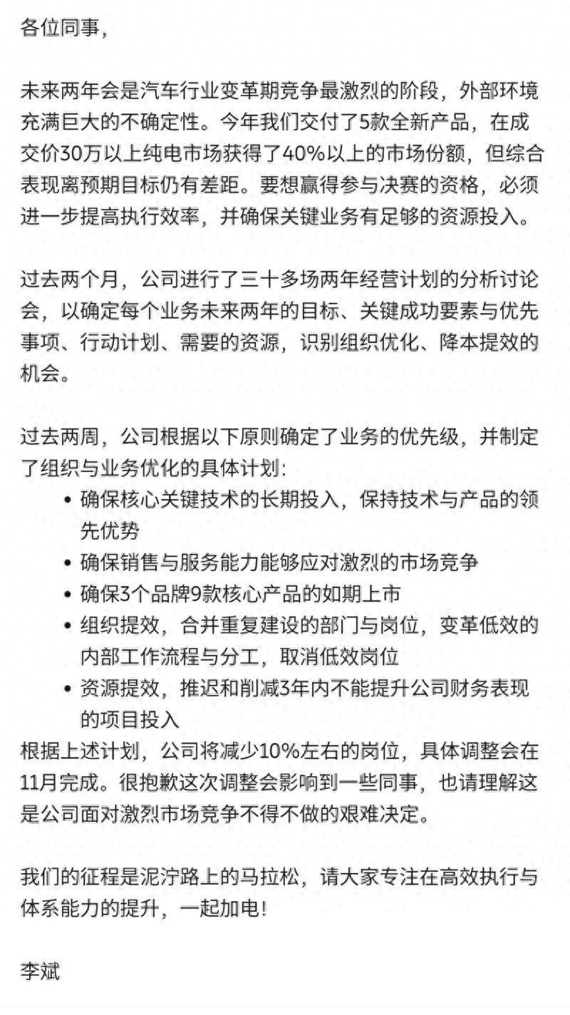 李斌在信中对裁员表示抱歉,并提到:“这是公司面对激烈市场竞争不得不做的艰难决定。”