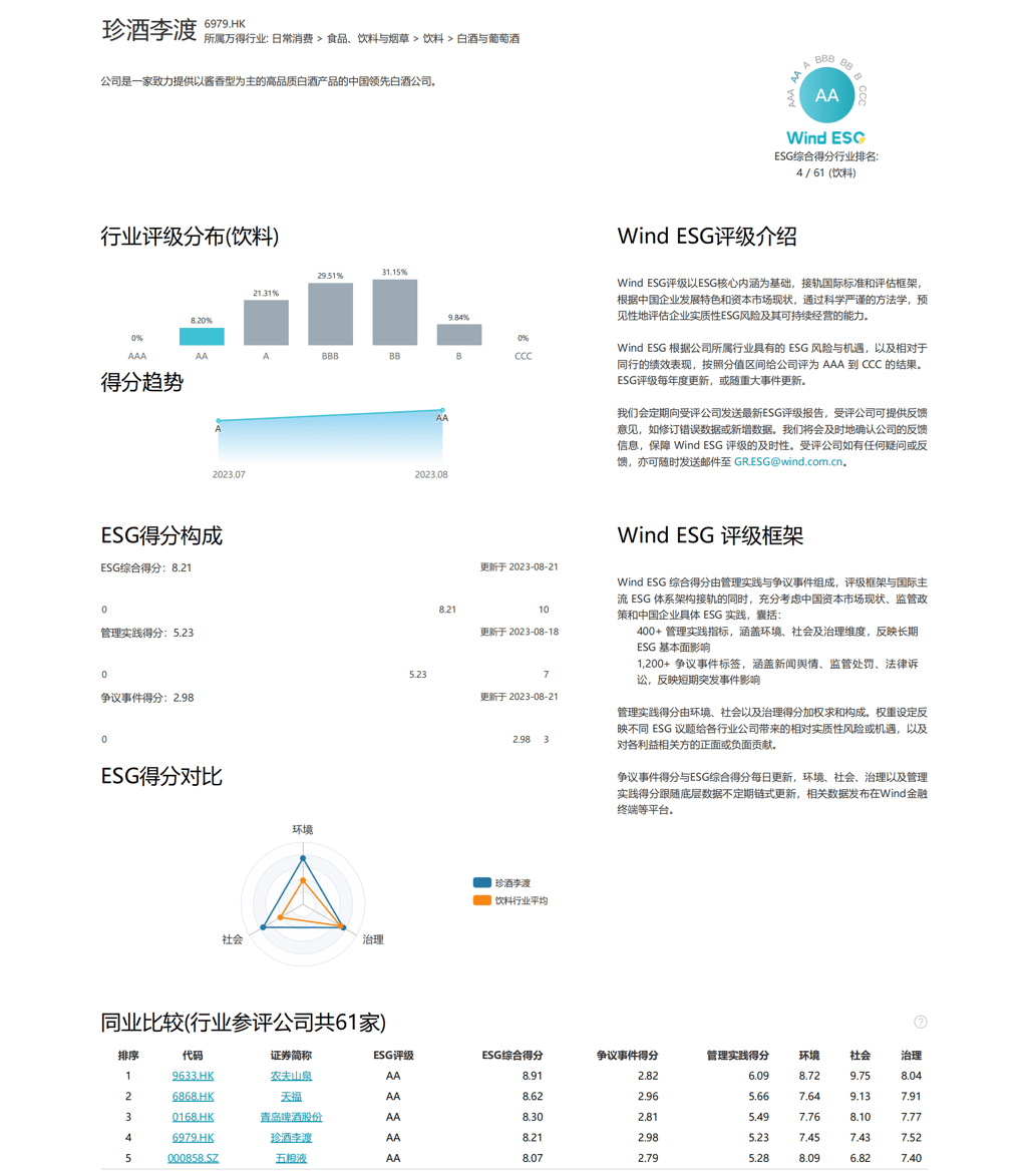 此次珍酒李渡ESG综合得分在饮料行业参评的61家企业中排名第四,白酒企业中排名第一,ESG评级“AA”级。