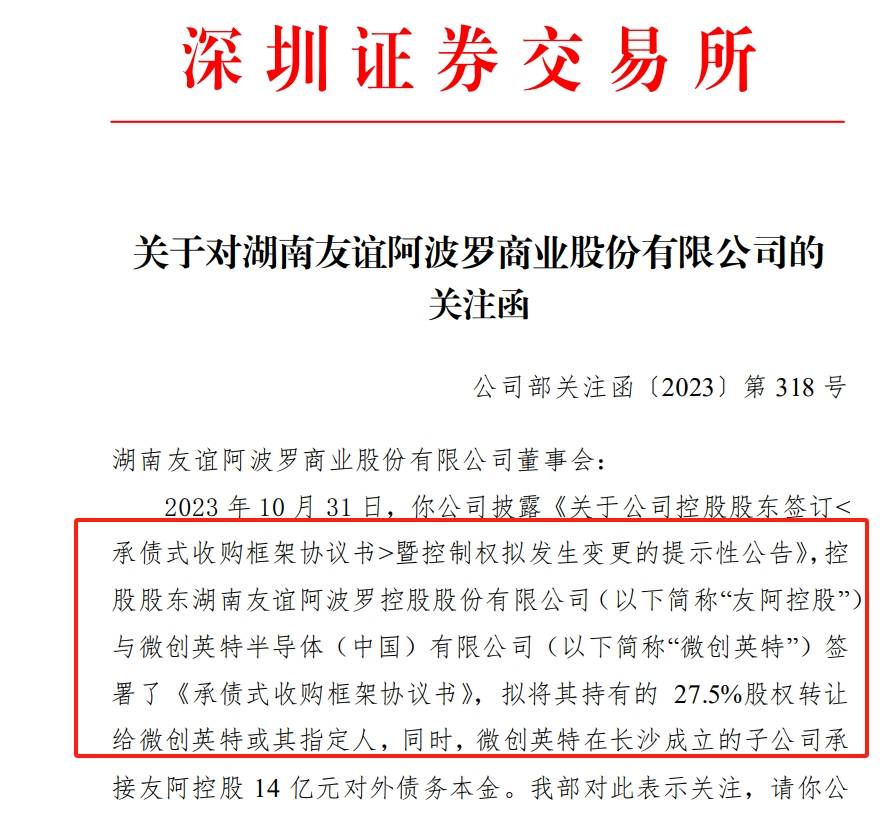 深交所向友阿股份下发了关注函,要求说明控制权转让事项对公司生产经营、主营业务可能产生的影响;补充说明在友阿控股所持股权处于质押情况下本次股权转让的可实现性,并自查是否存在其他股份限售而导致本次股权转让存在实质性障碍的情形。回复函要求在11月6日前报送并对外披露。