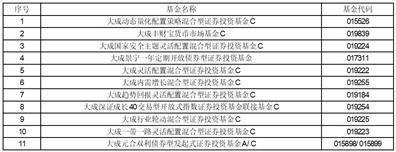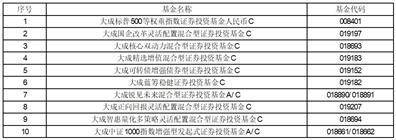 根据大成基金管理有限公司(以下简称“本公司”)与上海基煜基金销售有限公司签订的开放式证券投资基金销售服务协议,上海基煜基金销售有限公司将于2023年11月7日开始销售本公司旗下部分基金。投资者可通过上海基煜基金销售有限公司办理开户、申购、赎回、转换等业务,办理程序遵循基金的法律文件和上海基煜基金销售有限公司相关规定, 具体基金如下: