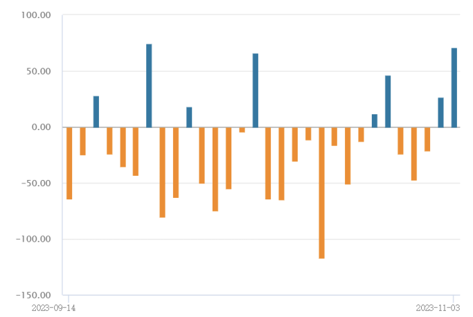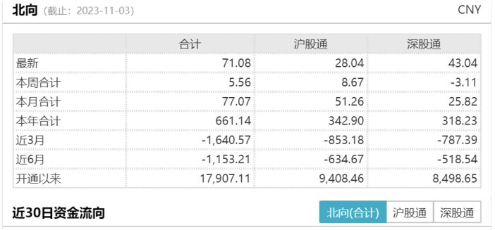 11月3日,A股三大指数集体收涨,沪指涨0.71%,收报3030.80点;深证成指涨1.22%,收报9853.89点;创业板指涨1.47%,收报1968.21点。市场成交额达到8095亿元,北向资金全天实际净买入71.08亿元,其中沪股通净买入28.04亿元,深股通净买入43.03亿元。