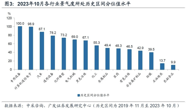 宏观数据看,10月PMI为49.5,低于前值的50.2,可能主要受季节性影响所致,且主要拖累项为上游原材料。而根据广发证券研究所统计数据,PMI数据映射的10月中观景气度数据来看,先进制造(汽车、医药、计算机、电气机械)景气明显改善;且新兴产业景气度出现上行,高端装备、新能源汽车环比改善较为显著。这也与政策支持方向一致。经济回暖的过程中,制造业的回暖有望持续拉动通用机械、工业母机等需求,也可持续关注工业母机等高端制造领域。