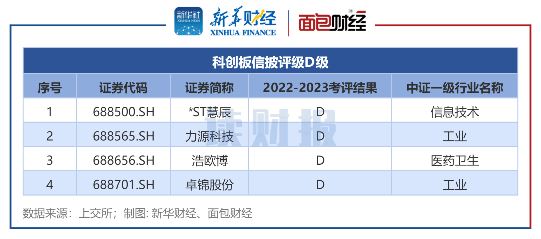 公开数据显示,2022-2023年度,有4家科创板公司信披考评为D,分别为*ST慧辰、力源科技、浩欧博和卓锦股份。