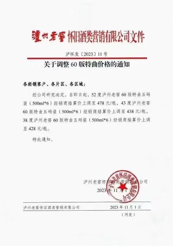 据酒讯了解,在贵州茅台发布上调出厂价公告次日,泸州老窖怀旧酒类营销有限公司也针对沪州老窖60版特曲上调了经销商结算价。