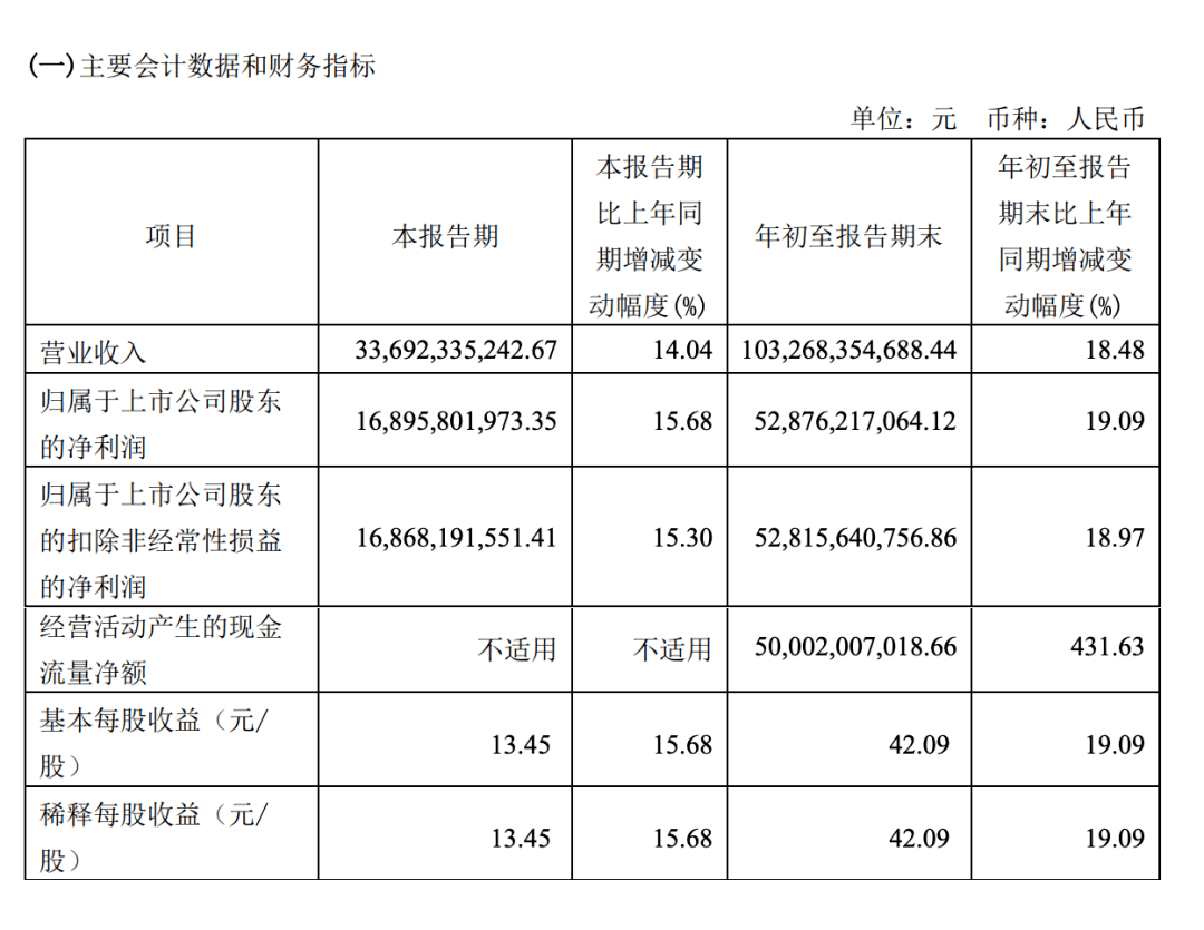 根据前三季度业绩来看,贵州茅台1-9月实现营业收入1032.68亿元,同比提升18.48%;归属于上市公司股东的净利润528.76亿元,同比提升19.09%;经营活动产生的现金流量净额为500.02亿元,同比提升431.63%。其中,贵州茅台旗下茅台酒实现营业收入872.7亿元。