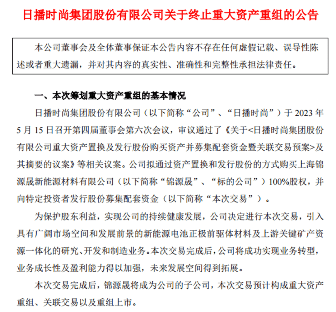 5日晚间,日播时尚发布公告称,公司决定终止收购上海锦源晟新能源材料有限公司100%股权;并表示需待各方具备条件后,再行协商是否继续推进重组相关事宜。