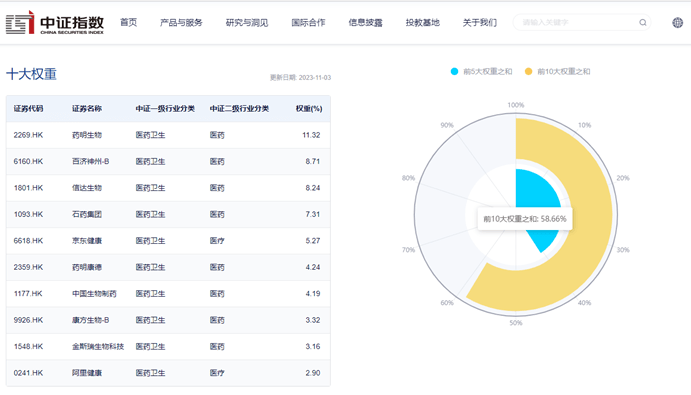 截至2023年11月3日,该指数前十大权重股包括药明生物、百济神州-B、信达生物、石药集团、京东健康等,前十大权重股比重合计约为58.66%。(数据来源:中证指数公司,指数成份股不代表个股推荐)