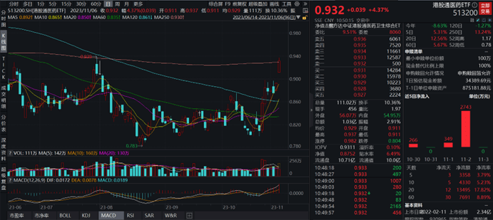 截至2023年11月6日10:50,港股通医药ETF(513200)早盘上扬,已涨4.37%,报0.932元,成交额1.03亿元,委比近10%,买盘活跃,市场资金持续关注。
