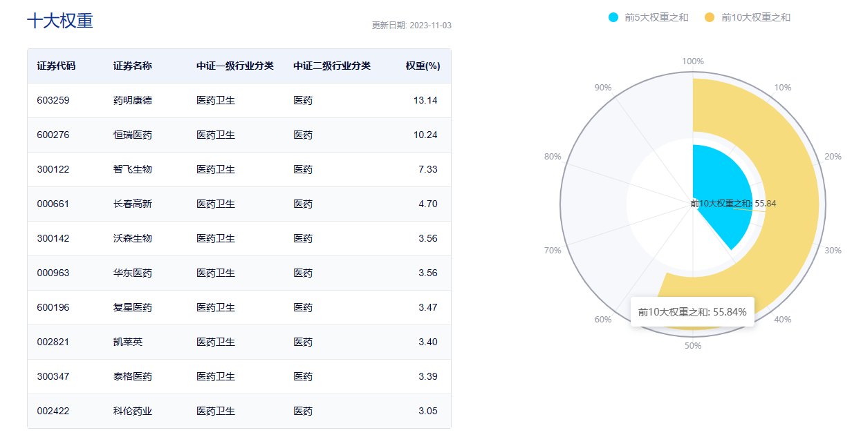 数据显示,截至2023年11月3日,该指数前十大权重股包括药明康德、恒瑞医药、智飞生物、长春高新、沃森生物等,前十大集中度为55.84%。(数据来源:中证指数公司,指数成份股不代表个股推荐)