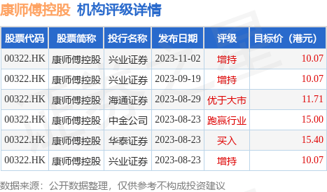 截至2023年11月3日收盘,康师傅控股(00322.HK)报收于10.56港元,上涨2.13%,换手率0.04%,成交量251.6万股,成交额2649.9万港元。投行对该股的评级以增持为主,近90天内共有3家投行给出增持评级,近90天的目标均价为12.05港元。兴业证券最新一份研报给予康师傅控股增持评级,目标价10.07港元。