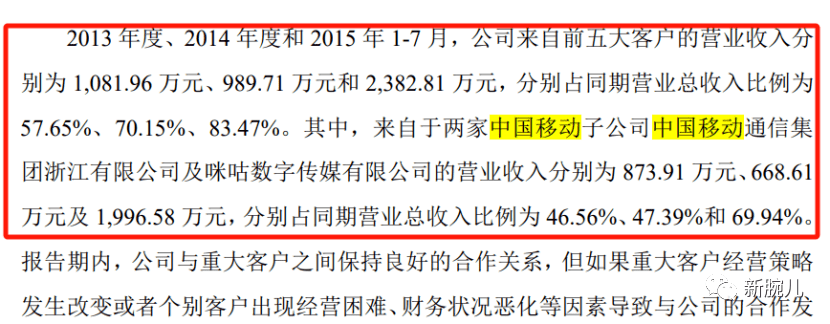 新腕儿(bosandao)翻阅了点众曾在新三板的公开转让书,从其公开的财务数据看到,点众从2013年至2015年1-7月期间,来自大客户中国移动的收入占比就达到46.56%、47.39%、69.94%。