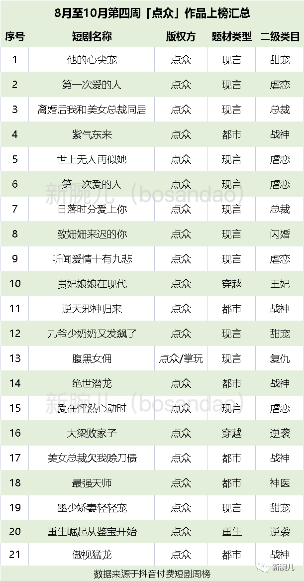 新腕儿整理了点众从8月至今,每周登榜的短剧作品制成列表,一共是21部。