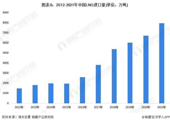 012-2021年,我国LNG进口量呈现快速增长趋势。2021年我国LNG进口量创新高,全年共进口7941万吨LNG较2020年增长18.3%。