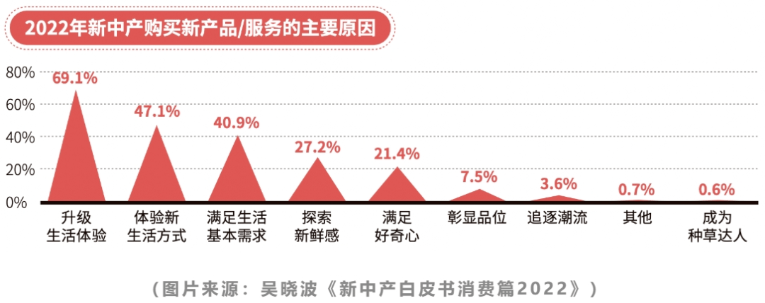 另一方面,新中产也是更注重“体验式”消费的一群人,也更热衷于尝试新鲜事物。新中产群体将更多的时间用于陪伴家人、锻炼身体和文化体验中,追求的是文化享受和成长体验。数据显示,近7成的新中产在购买新产品/服务时的主要原因是升级生活体验,其次是体验新生活方式,随后才是满足生活基本需求。
