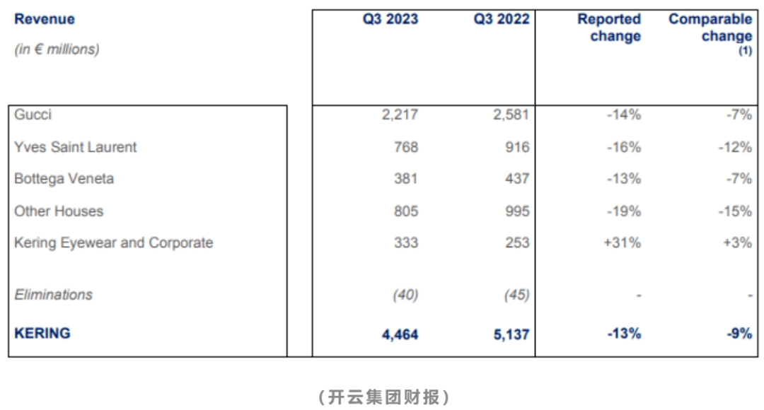 第二大的KERING(开云集团)的数据更加不理想。根据开云集团的财报,23年Q3销售额同比下跌了13%(按即时汇率计算),旗下众品牌中,除了Kering Eyewear实现31%增长外,其余品牌下跌均超过10%;而过去贡献主要利润来源的Gucci下跌了14%,在中国市场、欧洲市场、北美市场均出现了不同程度的下跌。今年7月,为了寻求中国市场的增长,Gucci在京东开设了官方旗舰店,发售男女装成衣、配饰、手袋、鞋履以及童装等全系列产品,但从结果来看,并未起到决定性的逆转,也可以说,销量下跌可能跟渠道没太大关系。