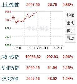 11月6日,A股主要指数高开高走,截至午间收盘,沪指半日收涨0.88%报3057点,深证成指涨2.06%收复10000点,创业板指涨3.15%收复2000点。两市半日成交6701亿元。