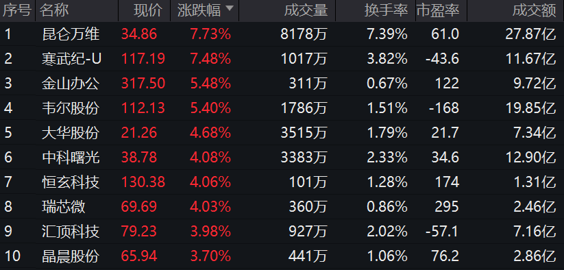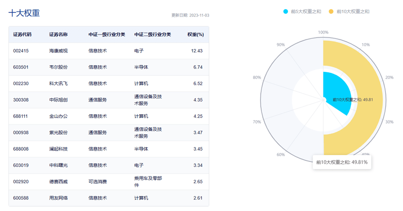 数据显示,截至2023年11月3日,该指数前十大权重股包括海康威视、韦尔股份、科大讯飞、中际旭创、金山办公等,前十大权重股合计占比约为49.81%。(数据来源:中证指数公司,指数成份股不代表个股推荐)