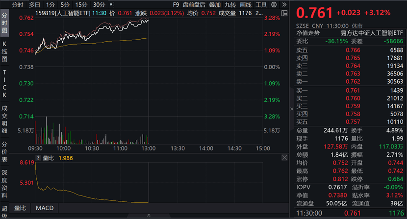 截至2023年11月6日中午收盘,人工智能ETF(159819)早盘收涨3.12%,半日成交额达1.84亿元。与此同时,云计算ETF (516510)收涨2.94%,软件30ETF (562930)收涨3.25%。