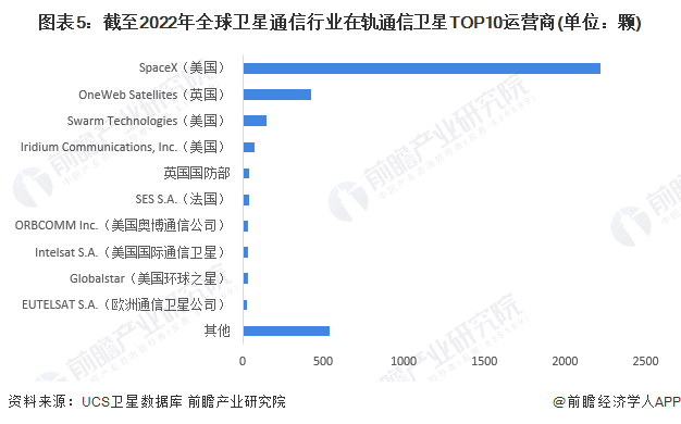 根据UCS卫星数据库,在轨通信用途卫星的前10位运营商中,TOP1企业为美国的SpaceX公司,其发射数量达到2219颗,占据全球61.23%的数量。
