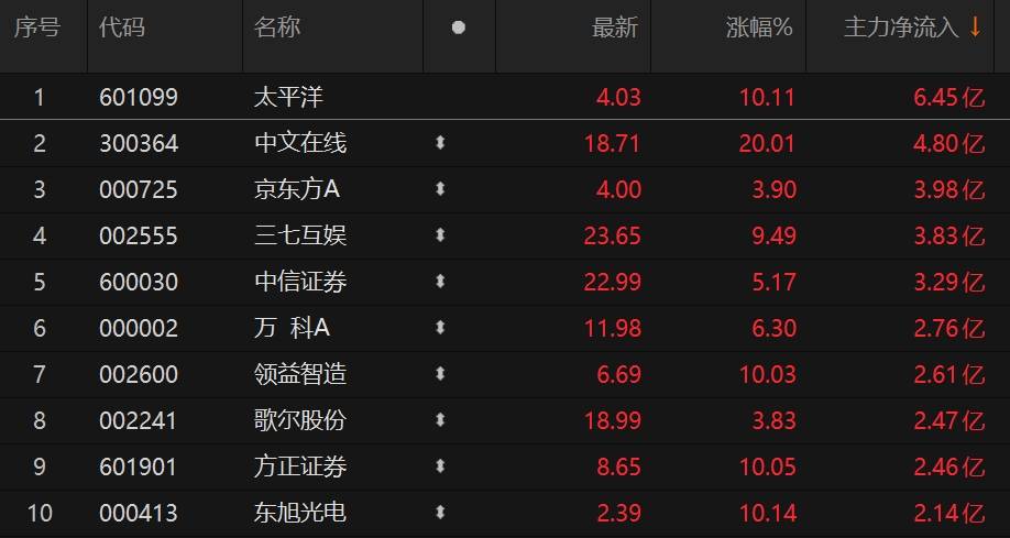 2023年11月6日,今日A股早盘主力资金净流入前十股份,共计净流入34.80亿元。其中太平洋、中文在线、京东方A位列前三,分别净流入6.45亿元、4.80亿元、3.98亿元。以上信息不构成投资建议。