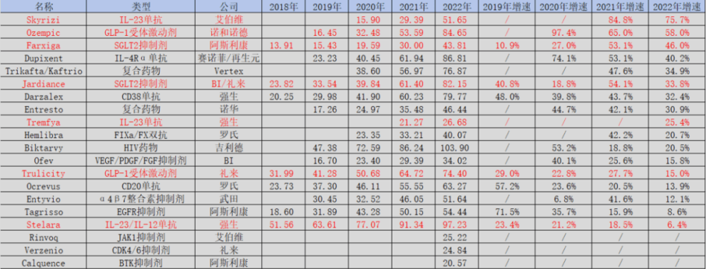 图:2018年和2022年全球药物销售排名TOP 20对比,来源:锦缎研究院