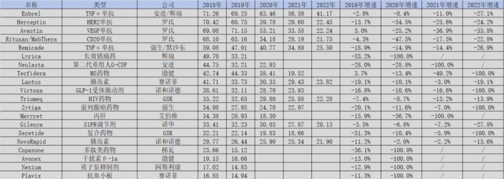 纵观这些药物,曾经火爆的单抗药物和胰岛素药物在其中的占比较大,尤其几款单抗产品,随着生物类似药的入局逐渐泯然众人,而胰岛素类药物的失势则主要受美国市场降价以及各种新型控糖药物兴起影响。
