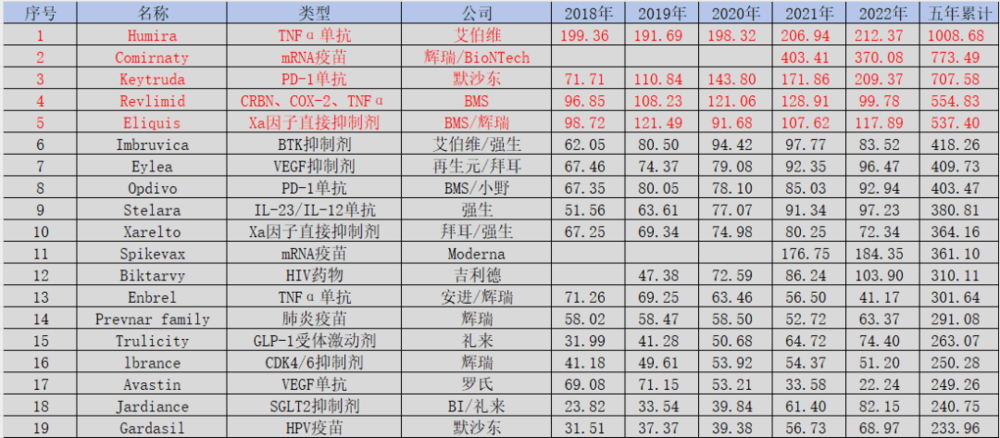 图:2018~2022年全球药物总销售排名TOP 20,来源:锦缎研究院