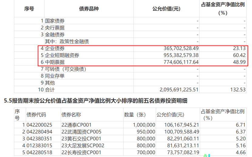 在9月底的持仓中,东兴兴瑞一年定开98.86%的仓位为债券,其中企业债券仓位有23.13%,企业短期融资券仓位为60.42%,中期票据仓位为48.99%,持有的前五名债券依次为:22通泰CP001、22武清国资CP005、23黄石交投CP001、23大足发展SCP002、22长寿投资CP001,合计占基金资产净值的比例为28.10%。