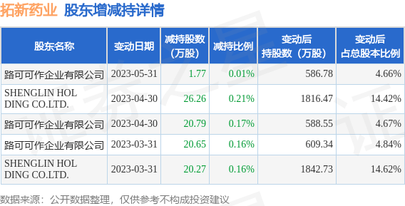 6月21日拓新药业发布公告《拓新药业:关于股东减持时间过半的进展公告》,其股东路可可作企业有限公司、SHENGLIN HOLDING CO.LTD.于2023年3月29日至2023年5月31日间合计减持89.74万股,占公司目前总股本的0.7122%,变动期间该股股价上涨39.6%,截止5月31日收盘报76.07元。