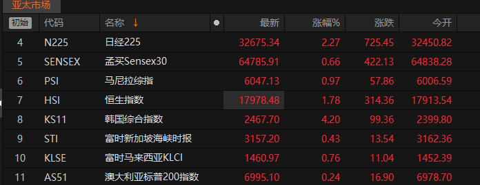 原标题:亚太股市午间全线上涨 韩国综合指数涨超4%