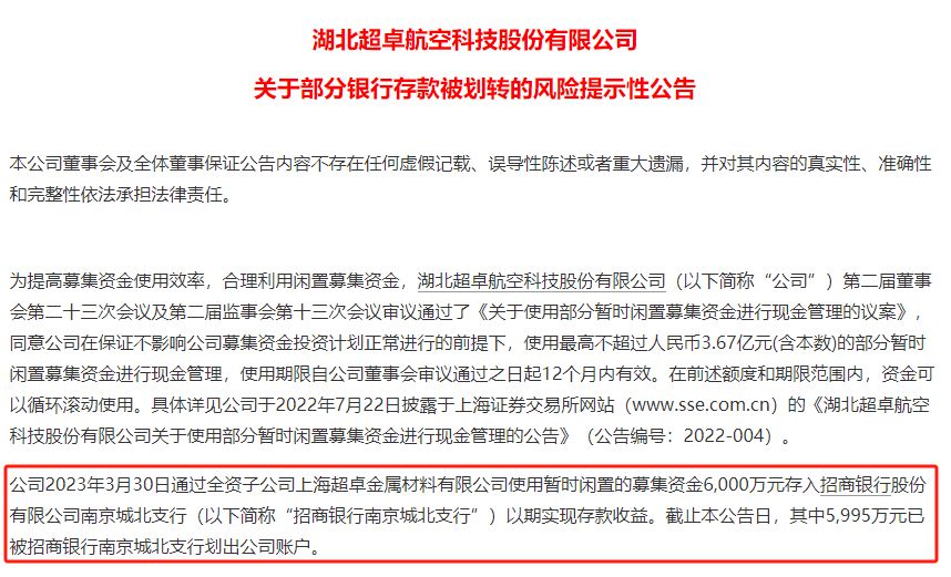 据公告内容显示,超卓航科在不知情的情况下,5995万元被招商银行南京某支行划入保证金存款账户,用于两家与超卓航科不存在任何关联关系和业务往来的企业进行承兑汇票的行为。