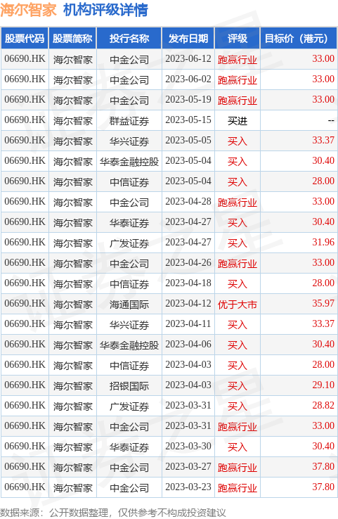 截至2023年6月21日收盘,海尔智家(06690.HK)报收于24.55港元,上涨0.61%,换手率0.34%,成交量965.43万股,成交额2.36亿港元。投行对该股的评级以买入为主,近90天内共有12家投行给出买入评级,近90天的目标均价为31.99港元。中金公司最新一份研报给予海尔智家跑赢行业评级,目标价33港元。
