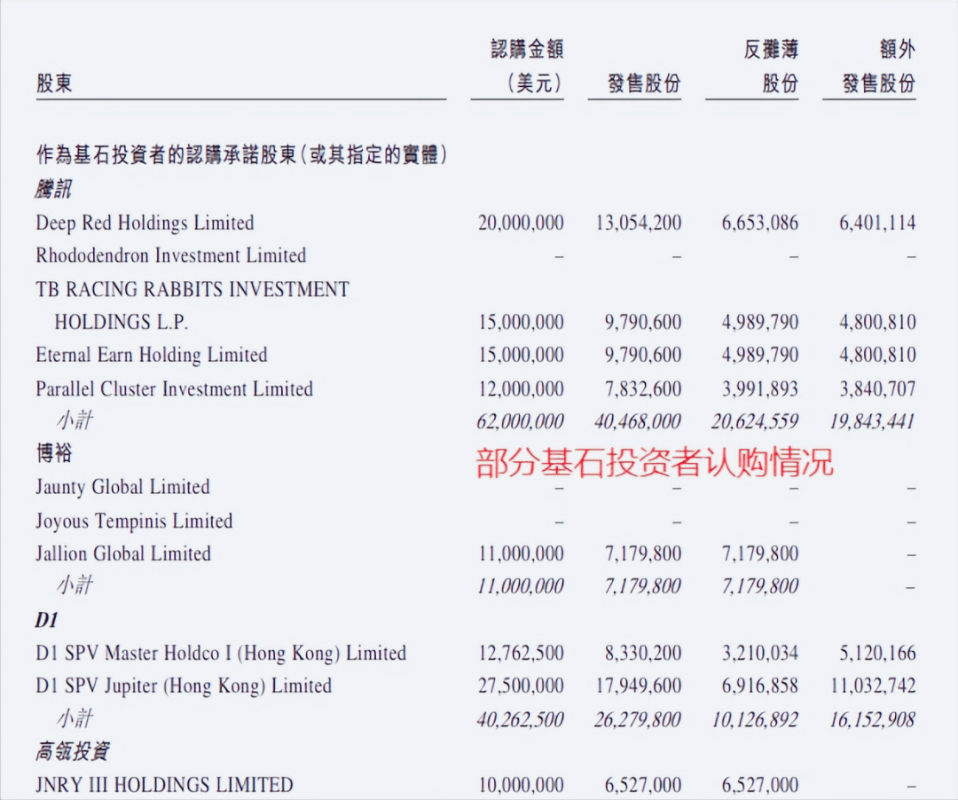 和众多港股公司一样,极兔也找到基石投资者,且阵容相对豪华,共9位:分别为Aspex Management、博裕资本、D1 Capital、GLP、红杉、顺丰、淡马锡、腾讯和高瓴,合计认购金额大约2亿美元,约占募资总额5亿美元40%左右。