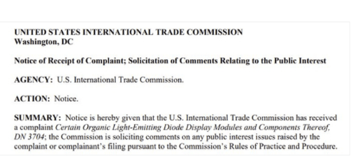 根据美国国际贸易委员会的文件,三星显示于10月31日发起投诉,指控京东方违反了美国关税法,该法案涉及“不公平竞争方法”,其中包括侵犯知识产权。京东方违规行为包括在有机发光二极管(OLED)显示模块和组件领域侵犯三星显示商业秘密等知识产权。