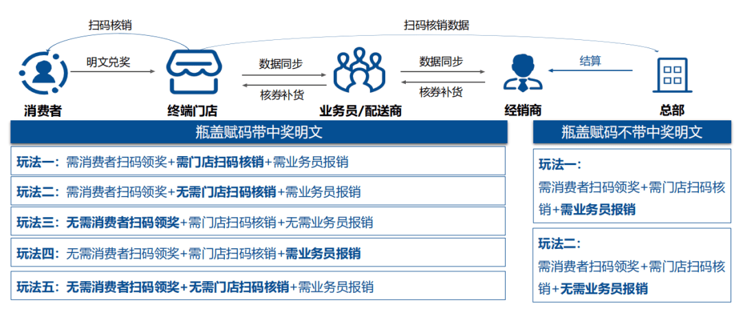 瓶盖内印二维码,消费者购买产品开盖扫码参与活动,按中奖概率抽N元换购券,抽中换购券的用户到店出示二维码给店老板扫码核销,核销成功后消费者支付N元给门店兑换一瓶产品,同时门店获取一张“返货券”+核销返利,业务员定期到店给门店核销返货券补货,返货券汇总至经销商账户,总部最后定期给经销核销补货,整个活动过程全部是在线化执行,费用在线化发放核销,门店不用再回收瓶盖,实现营销场景的在线化。(方案详情可点击文章更多了解:一元换购是“多码合一”最标准的bC一体化打法!)