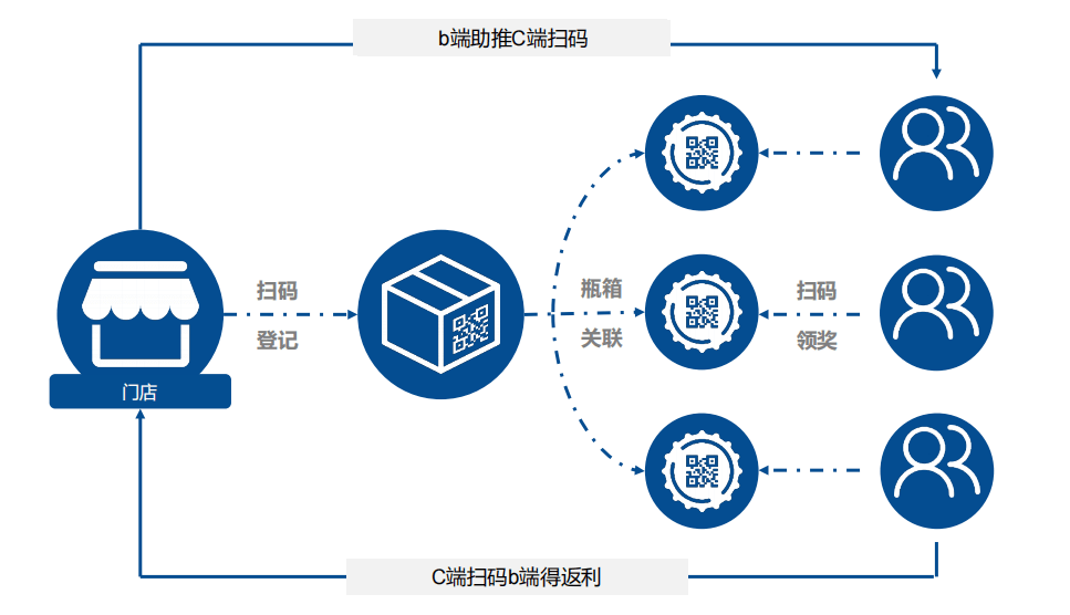 针对门店的动销,可以把箱码作为关联动销码,和瓶码相关联,可发门店老板开箱奖+门店推荐返利奖;门店老板开箱扫码,系统获取门店信息在后台进行比对,系统判断为门店身份,扫码成功即可获取开箱红包。门店老板积极推荐,产品卖出后,门店实时获得奖励;借此提高门店开箱率、积极卖货率。(方案详情可点击文章更多了解:bC技术绑定10讲②解读“bC双码关联”!)