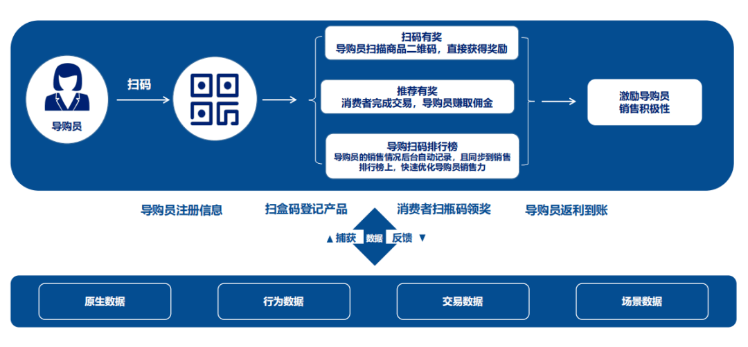 此方案和前一个略有不同。导购员扫码登记后,可扫码直接领取奖励,也可推荐获得奖励,通过利益驱动刺激导购员的销售积极性,把导购员关联起来。在这个环节可设置类似区域销售排行政策,销售名次越前,奖励越高。排行榜每天会实时显示,并可设置预计每两周进行一次评选,区域前10名获得额外奖励(如现金100元),增强b端卖货动力。(方案详情可点击文章更多了解:bC技术绑定10讲②解读“bC双码关联”!)