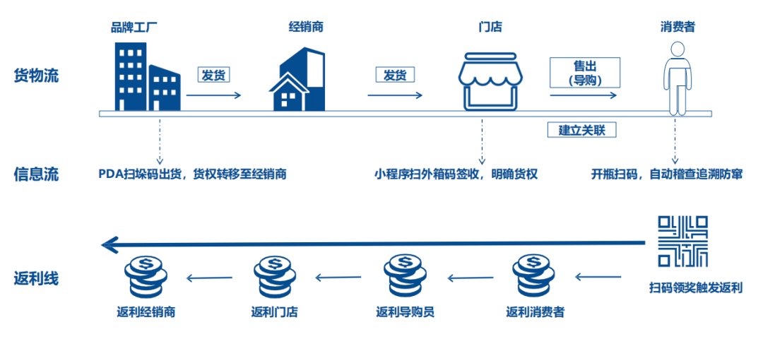 通过把营销费用作为指挥棒,以明晰的货物流向+渠道关系结构为基础,将既定部分进货折扣通过以C端真实的互动数据作为触发点进行全渠道返利,赋能总部实现价盘管控、终端库存掌控(有效期)和防窜货追溯管理。(方案详情可点击文章更多了解:“窜货返利”是防窜货的杀手锏!)