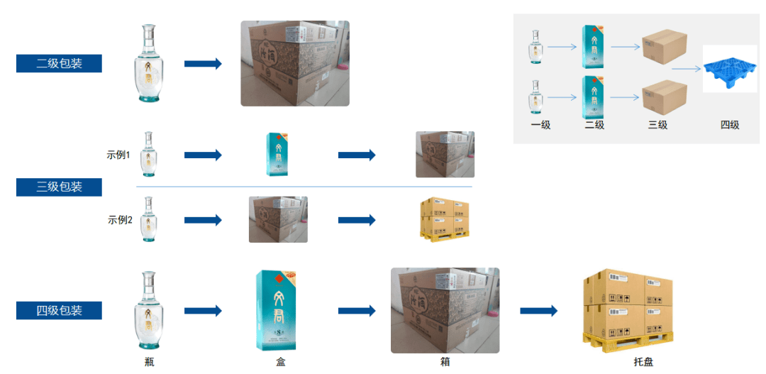 白酒行业除了光瓶酒,通常一瓶酒的包装都会涉及到瓶、盒、箱、垛,也因此白酒行业五码合一通常都是采用四级关联的自动采集方式,通过“瓶、盒、箱、垛”关联,形成五码合一。