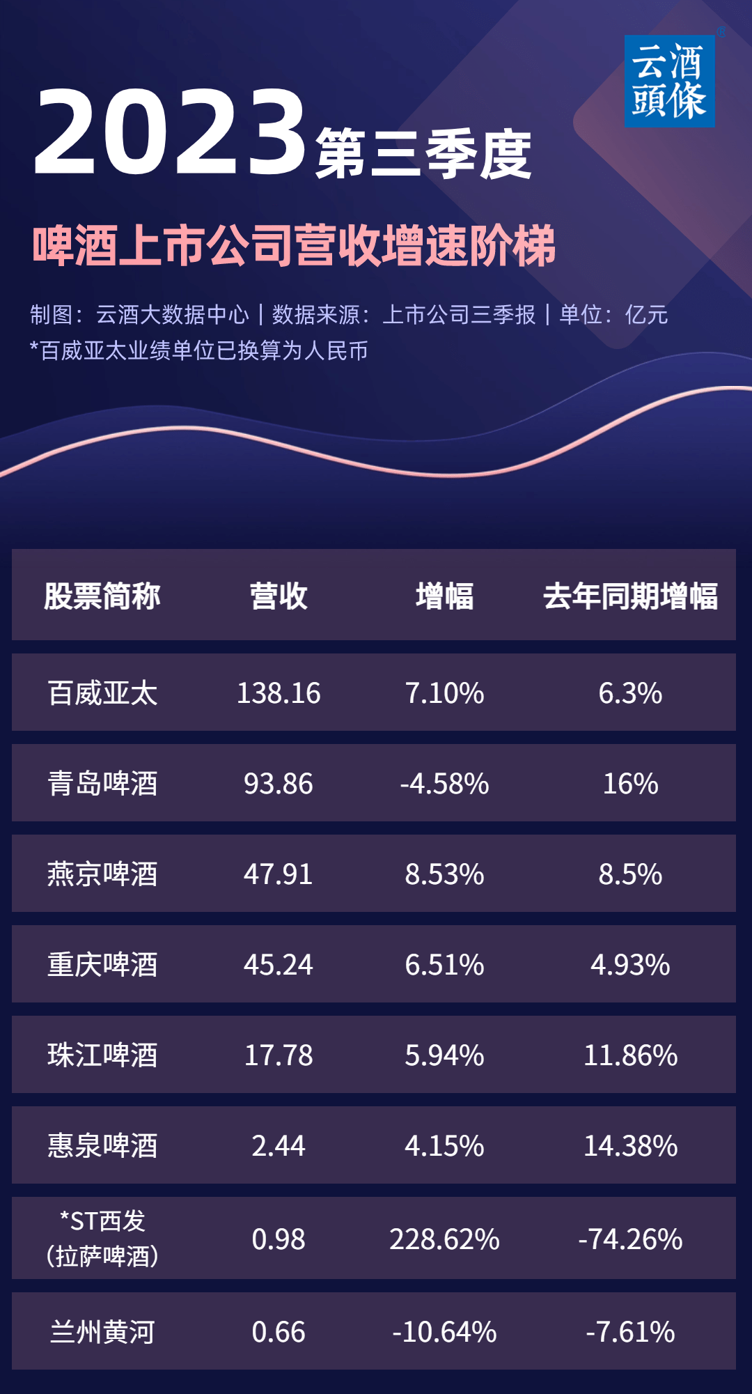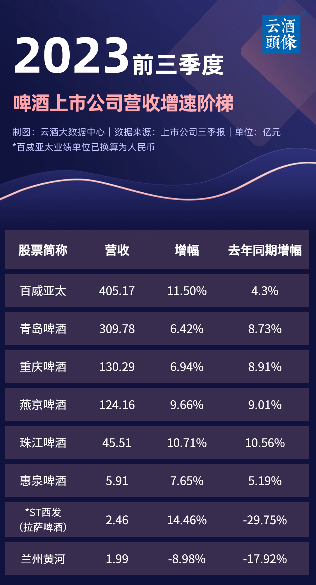 今年1-9月,青岛啤酒营收309.78亿元,同比增长6.42%;重庆啤酒营收130.29亿元,同比增长6.94%;燕京啤酒营收124.16亿元,同比增长9.66%;珠江啤酒营收45.51亿元,同比增长10.71%。